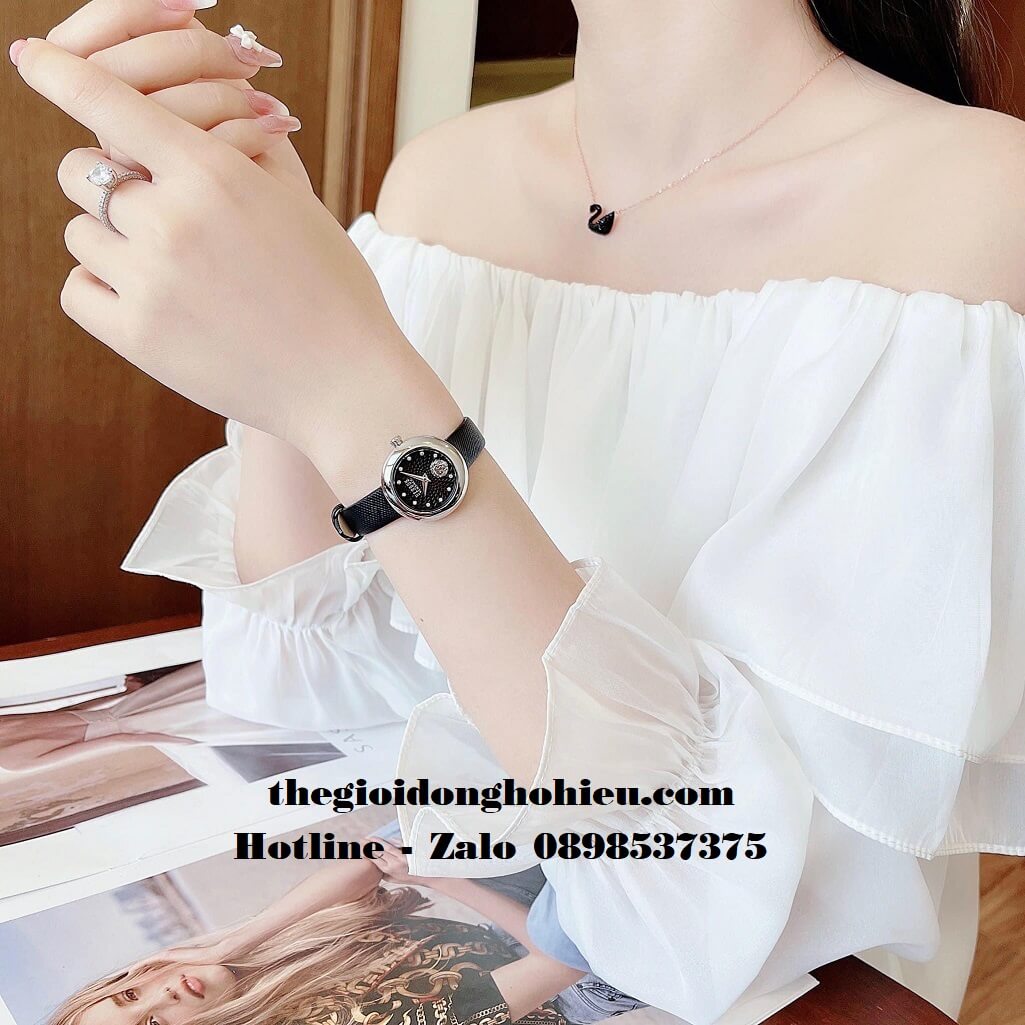 Dây da saffiano màu đen siêu dễ phối đồ, mặt dial màu đen cùng tone dây, cọc giờ đính đá swarovski tạo thành một tổng thể nhẹ nhàng, lên tay cực kỳ xinh