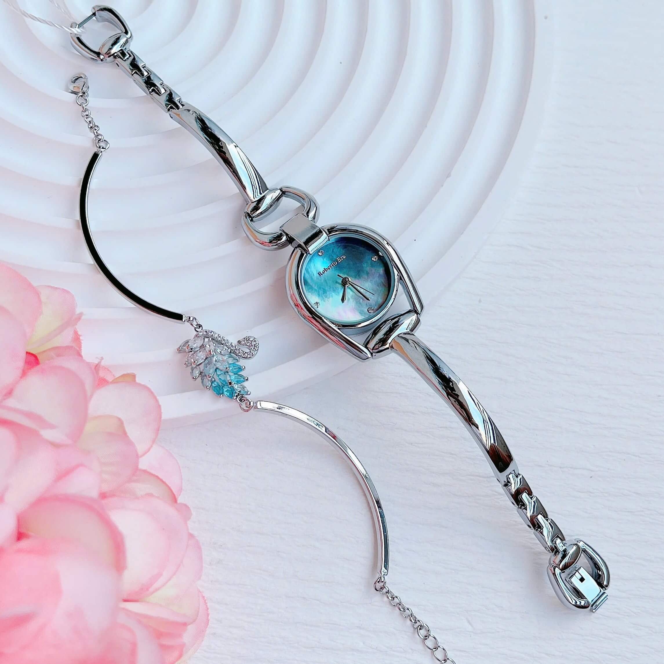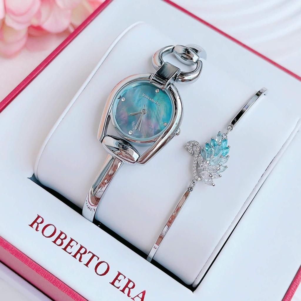 Set đồng hồ lắc tay nữ Roberto Era Horsebit RE9102 mặt xà cừ xanh size 28mm là mẫu đồng hồ thời trang mang phong cách sang trọng và tinh tế dành cho phái đẹp.