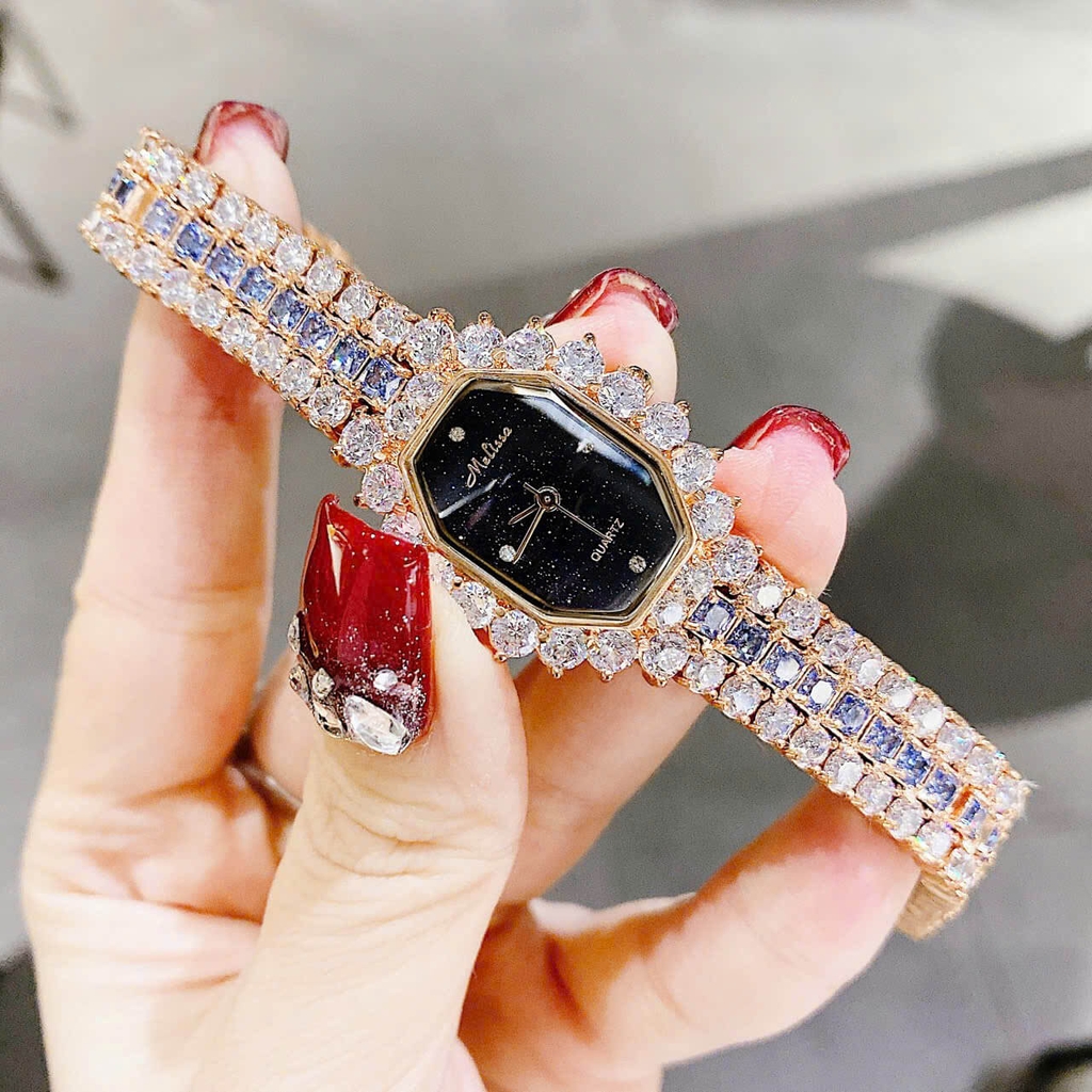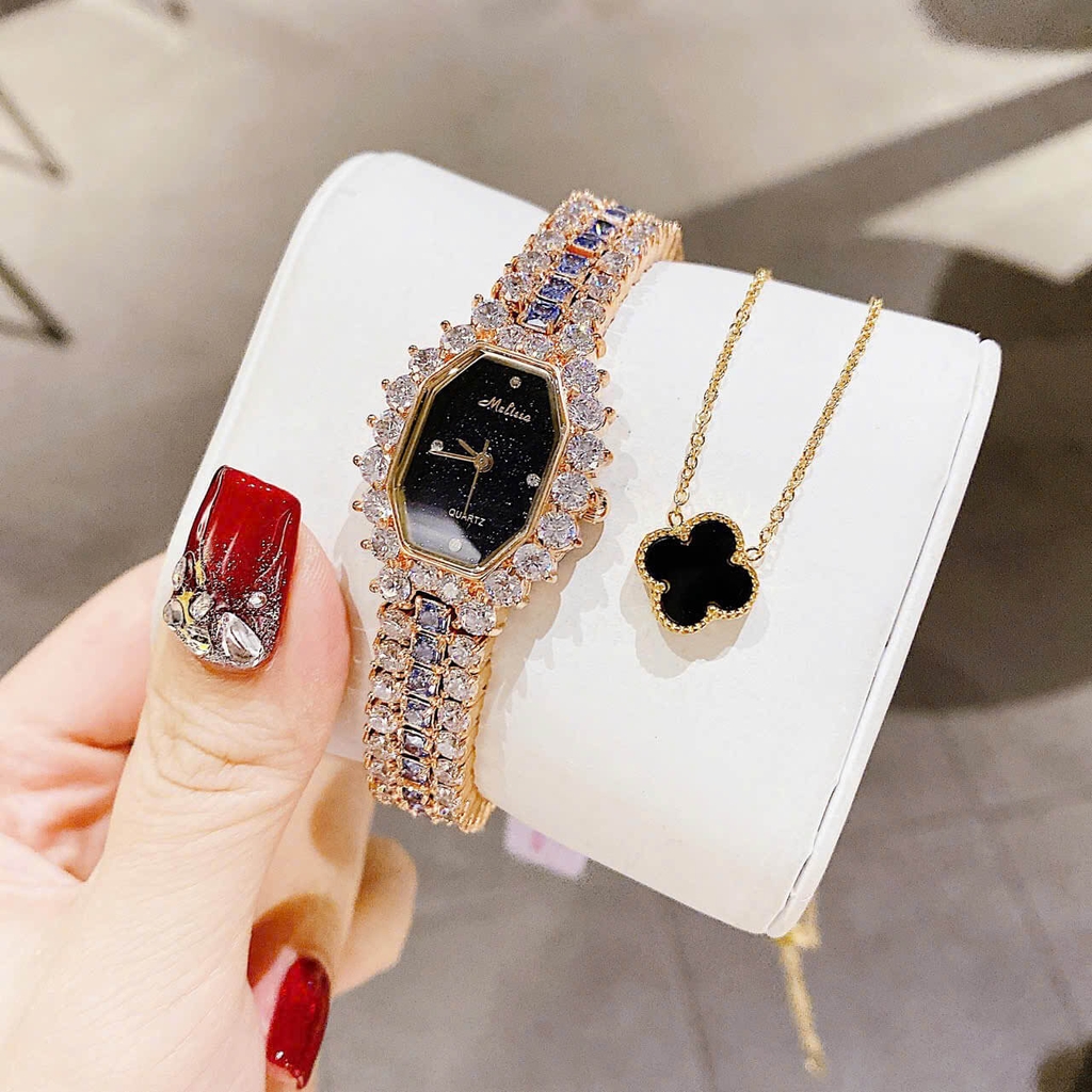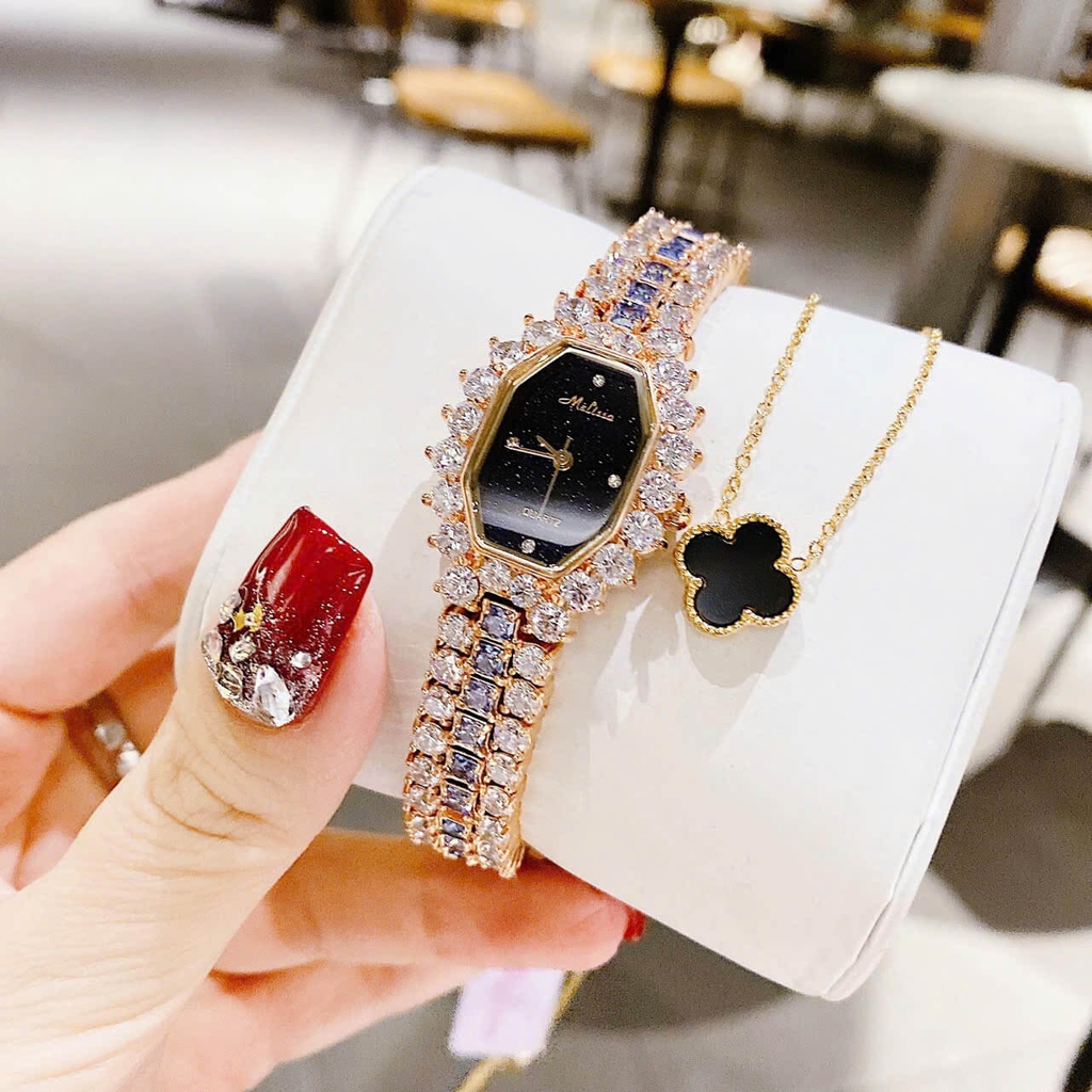 Set Đồng Hồ Nữ Melissa F8240 Chính Hãng Dây Lắc Tay Đính Đá Xanh Kèm Dây Chuyền